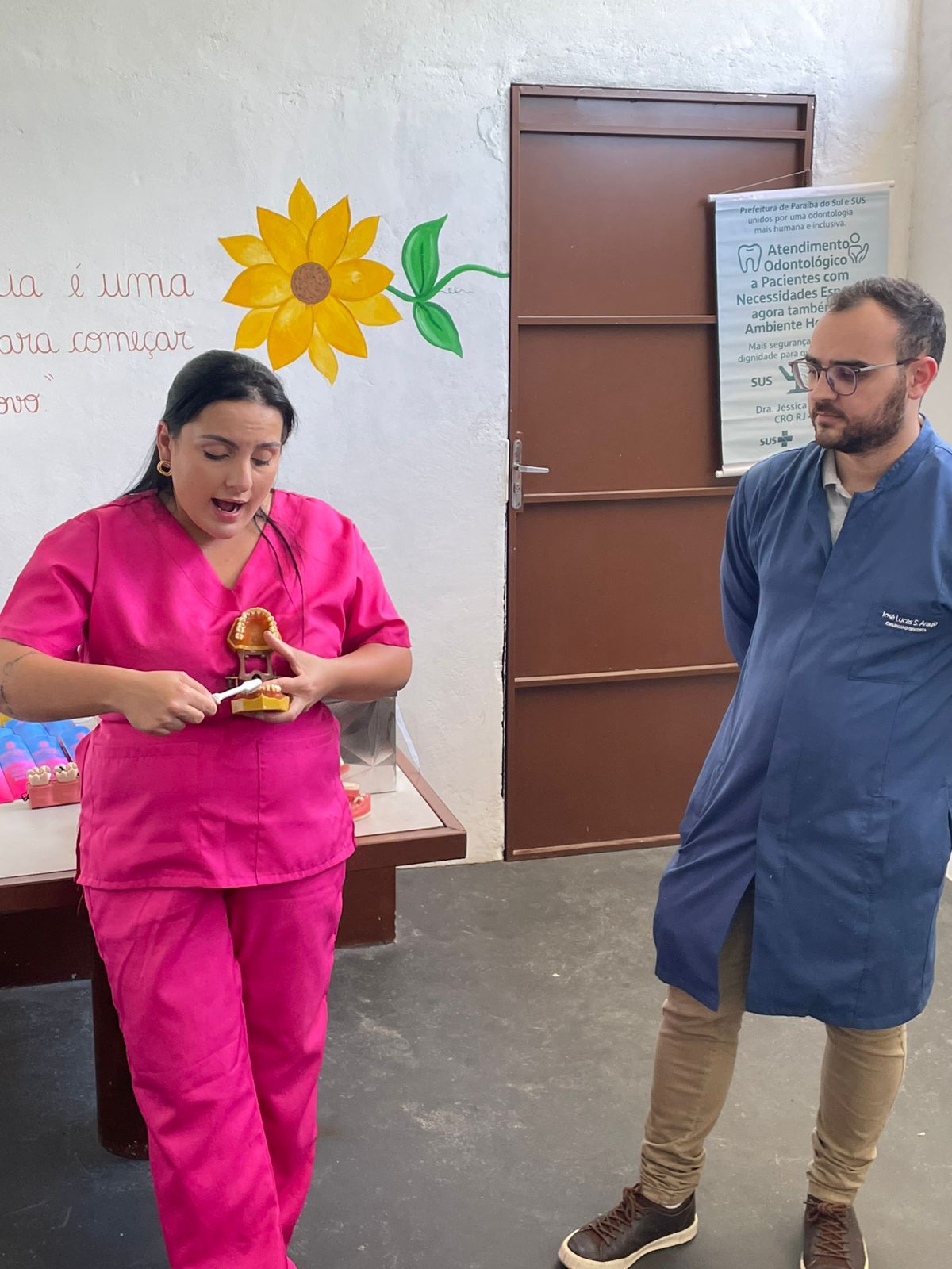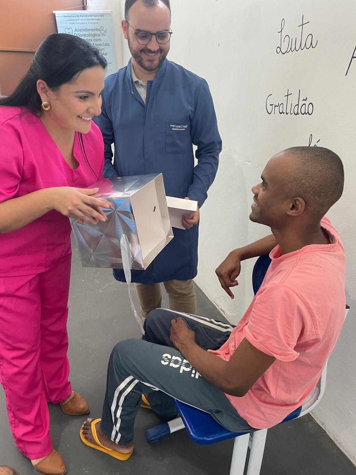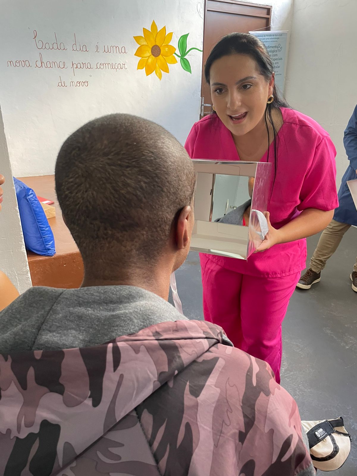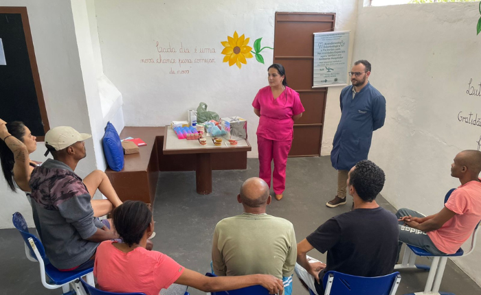 Durante a atividade com os pacientes, foram compartilhadas orientações simples, mas que fazem toda a diferença no bem-estar e na qualidade de vida: cuidados com a higiene diária, prevenção de doenças bucais e a importância de manter o sorriso saudável